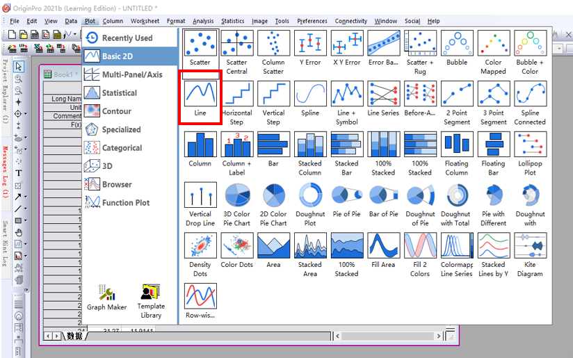 松开左键,点击菜单“Plot”,选择“Basic 2D”,“Line”,软件自动跳出画好的图。