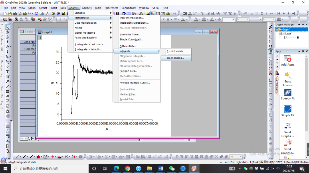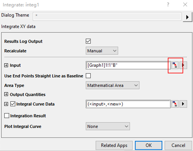 还是依次点击“Analysis”,“Mathematics”,“Integrate”,“Open Dialog” ,弹出Integrate对话框,勾选“Results Log Output” ,点击红框所示图标。