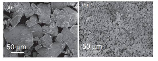 Fig.1 在不同溶液中合成的2,6-Naph(COOLi)2 SEM图 (a):水溶液;(b)甲醇