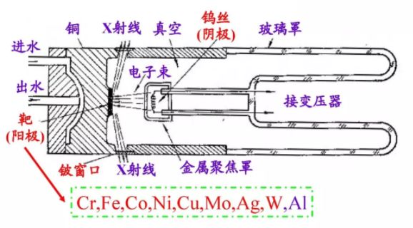 X 射线管的实质是个真空二极管,其阴极是钨丝,阳极为金属片。在阴极两端加上电流之后,钨丝发热,产生热辐射电子。这些电子在高压电场作用下被加速,轰击阳极(又称靶),产生X射线(此过程产生大量热量,为了保护靶材,必须确保循环水系统工作正常)。常见的阳极靶材有:Cr, Fe, Co, Ni, Cu, Mo, Ag, W,最常用的是 Cu 靶。