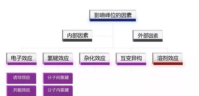诱导效应使振动频率向高波数移动;共轭效应使振动频率向低波数移动;氢键效应使伸缩频率降低,分子内氢键对峰位影响大且不受浓度影响,分子间氢键受浓度影响较大,浓度稀释,吸收峰位置发生改变;碳原子杂化轨道中s成分增加,键能增加,伸缩振动频率增加;溶剂极性增加,则极性基团的伸缩振动频率减小。