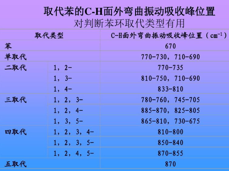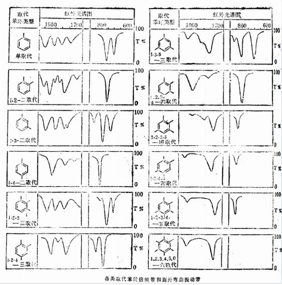 芳烃重要特征:在1600,1580,1500和1450cm-1可能出现强度不等的4个峰。C-H面外弯曲振动吸收880~680cm-1,依苯环上取代基个数和位置不同而发生变化,在芳香化合物红外谱图分析中,常用判别异构体。