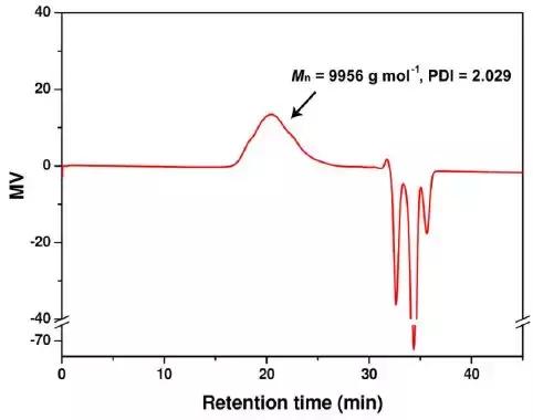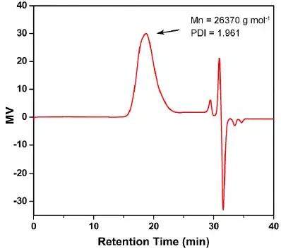 (Adv.Funct. Mater. 2018,1806567)此处主要表征聚合物的分子量。20min出峰为主要的聚合物峰,数均摩尔质量为26370g/mol;30-35min出峰主要为洗脱溶剂。