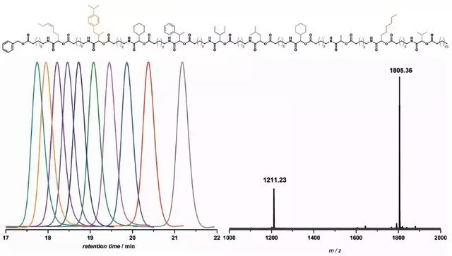 (Angew.Chem. Int. Ed. 2016, 55, 1204–1207)GPC用于监测反应。顶部的聚合物有10个不同颜色的取代基团,依次对应左下方不同取代基团聚合物的GPC谱图,右侧质谱图。接枝不同的基团后,聚合物的尺寸发生变化,聚合物保留时间也就随之改变,达到监测反应发生的目的。