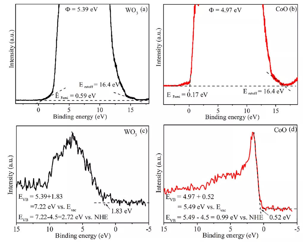 图1 WO3和CoO的(a,b)UPS和(c,d)VB-XPS谱图。