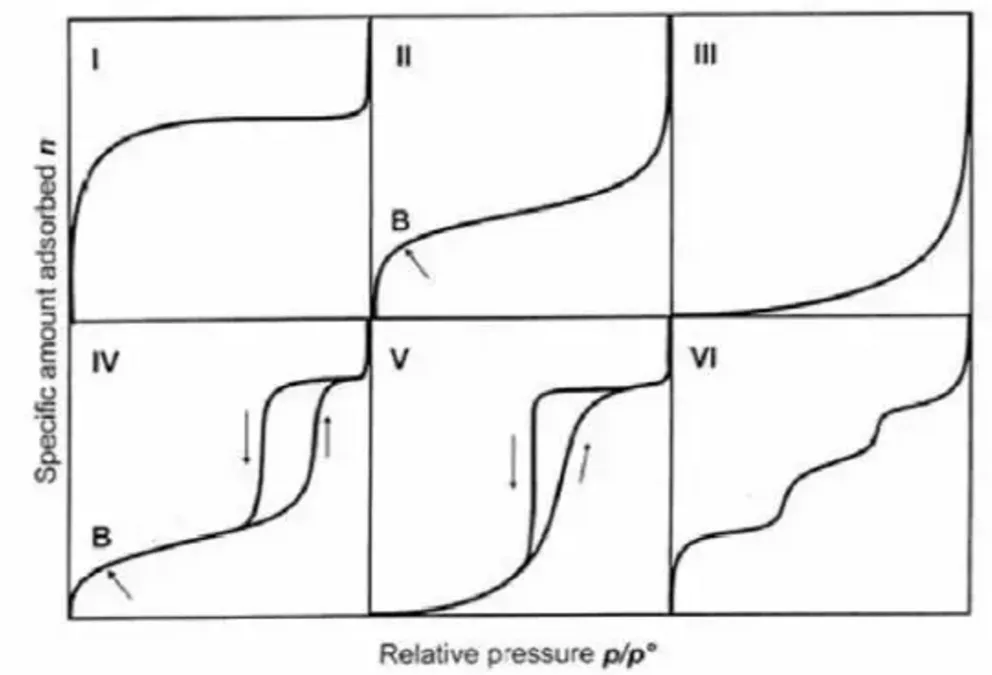 IV型等温线与II型等温线类似,但曲线后一段再次凸起,且中间段可能出现吸附回滞环,其对应的是多孔吸附剂出现毛细凝聚的体系。