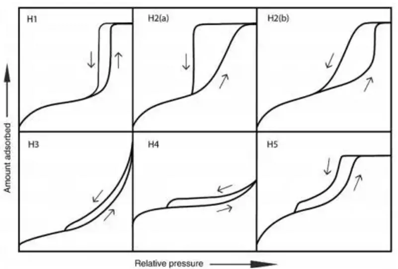 回滞环多见于IV型吸附等温线,根据最新的IUPAC的分类,有以下六种(1985年的标准主要是H1, H2a, H3, H4这四种)