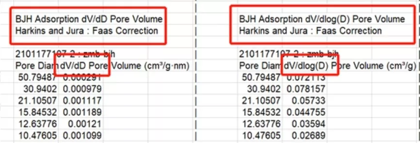 BJH方法吸脱附孔径分布原始数据,一般用dV/dD(或者dlogD)来作图,一般来说,孔径分布图应该以脱附曲线为准(desorption),查看dV/dD以及dV/dlogD图;