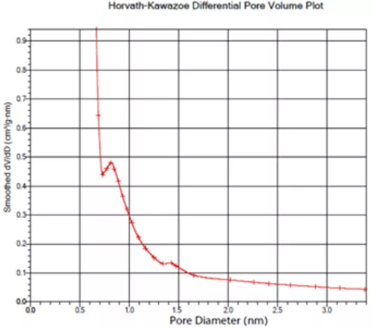 HK孔径分布:HK方法可以得到微孔部分的孔径分布。纵坐标最高点对应的孔径为微孔范围内样品最集中的孔的尺寸。