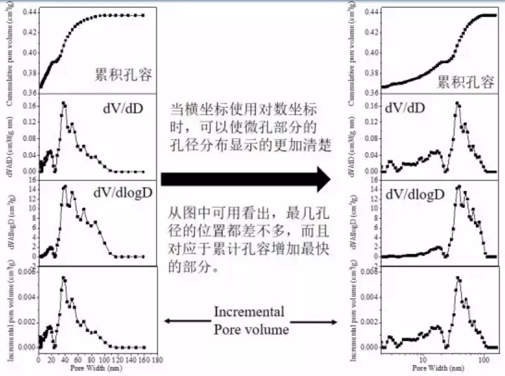 将不同的孔径分布作图方式列举在一起,有一个直观的印象。