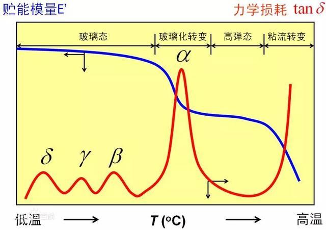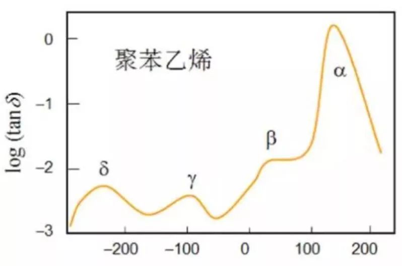 DMA采用升温扫描,由辅助环境温度升温至熔融温度,tanδ展示出一系列的峰,每个峰都会对应一个特定的松弛过程。由DMA可测出相位角tanδ、损耗模量E"与贮能模量E´随温度、频率或时间变化的曲线,不仅给出宽广的温度、频率范围的力学性能,还可以检测材料的玻璃化转变、低温转变和次级松弛过程。例如损耗峰能够代表某种单元运动的转变,图6为聚苯乙烯tg随温度变化的曲线,从图中可以推断峰可能为苯基绕主链的运动;峰可能是存在头头结构所致;峰是苯环绕与主链连接键的运动。