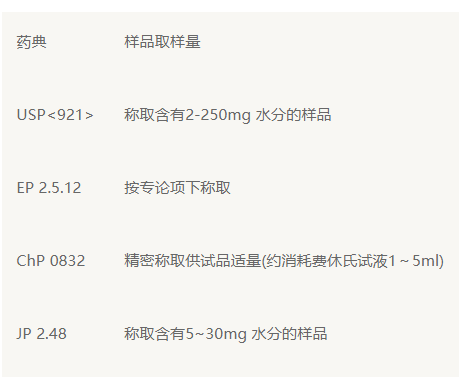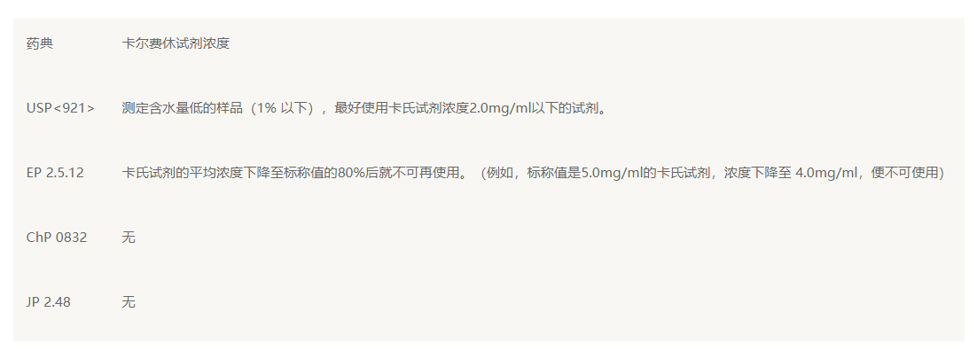 USP,ChP及JP均未要求对卡氏水分方法进行确认,但EP认为,水分测定的准确性与所选的卡氏试剂及以及其与样品的共同作用均有关系,因此要求按下面方法对其适用性进行确认。