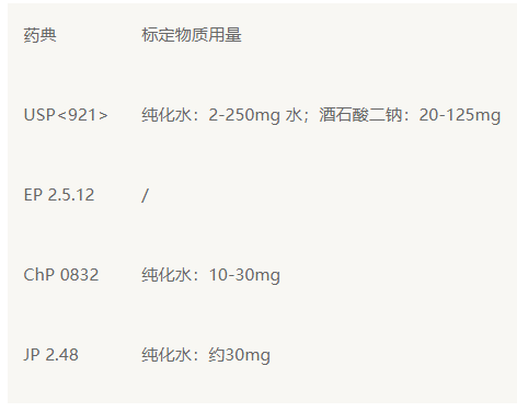 USP药典规定采用纯化水,酒石酸二钠,USP标准物质或其他商业采购的具有可追踪证书的国家标准物质;其中,水分含量较低的样品检测,建议用酒石酸二钠标定。