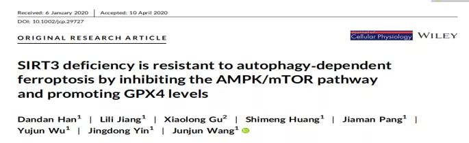 Dandan Han, Lili Jiang, Xiaolong Gu, Shimeng Huang, Jiaman Pang, Yujun Wu, Jingdong Yin, Junjun Wang. SIRT3 deficiency is resistant to autophagy-dependent ferroptosis by inhibiting the AMPK/mTOR pathway and promoting GPX4 levels. Journal of cellular physiology 2020, 235(11):8839-8851. DOI: 10.1002/jcp.29727.