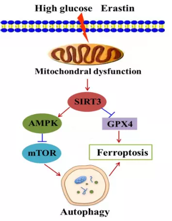最常见的两种细胞死亡形式是坏死和凋亡。随着研究的不断深入,研究者发现了其他细胞死亡方式,如细胞自噬、坏死性凋亡、细胞焦亡、铁死亡等。其中,细胞自噬是一种程序性的细胞死亡,可以消除过度错误折叠的蛋白和受损的细胞器。而铁死亡是铁依赖性的、非细胞凋亡性的细胞死亡形式,以脂质活性氧堆积为特点。在高糖浓度和高浓度刺激后,细胞中会产生过量的活性氧(ROS),可导致ROS的过度积累,最终这个持续的氧化应激引发糖尿病。ROS的积累会促进细胞自噬依赖性死亡,而细胞发生铁死亡时,也会有ROS的积累,脂质过氧化,线粒体外膜破裂等表现。可见,细胞的自噬与铁死亡之间存在着微妙的关系。然而这种关系目前尚未有清楚的解释。那么,细胞自噬与铁死亡之间存在着怎样的相互联系和潜在机制呢?