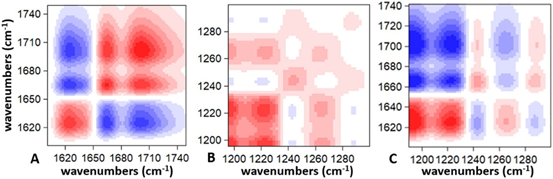 二维红外有2种定义,一种是对一系列相关的一维红外(普通红外)进行测试分析;另一种是直接通过仪器测试。目前我们提供的是第一种,常说的二维红外是对一系列相关的一维红外(普通红外)进行分析,这个是设置一个微扰条件,比如光、热、浓度等去测试,测试获得是一组(一般至少需要8个数据以上)常规红外数据(excel数据),而文献里面的二维红外光谱图(类似下图),这些都是需要经过单独的分析作出来的图。