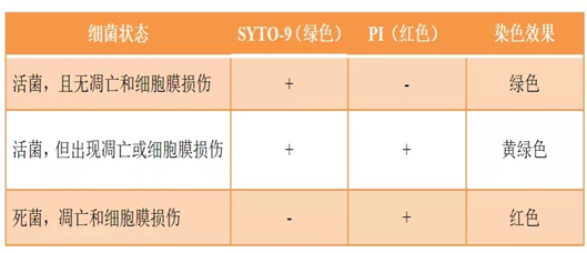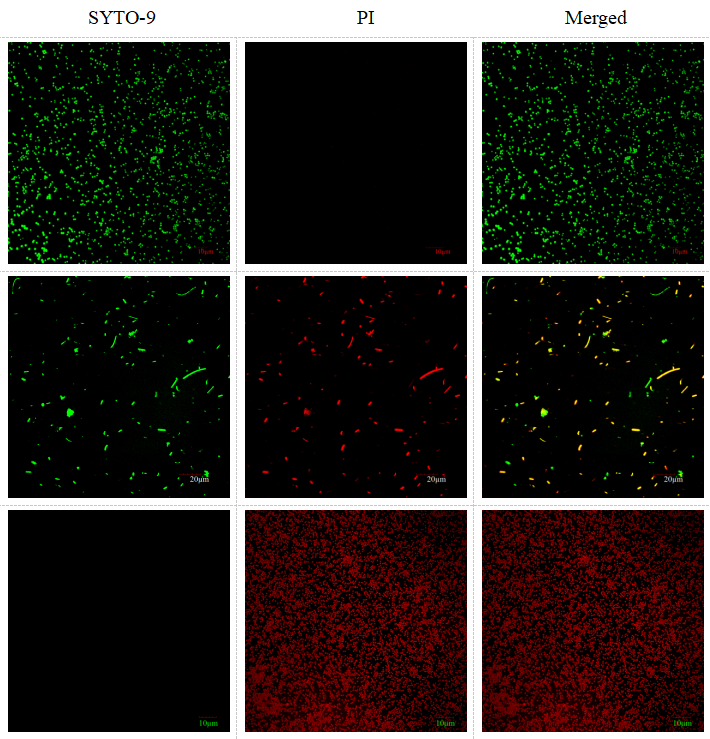 染色原理:SYTO-9是一种能够透过细胞膜的绿色荧光核酸染料,可用于活的和死的真核细胞的RNA和DNA染色,以及革兰氏阳性和革兰氏阴性细菌。PI是一种可对DNA染色的细胞核染色剂,在嵌入双链DNA后释放红色荧光。PI不能穿透完整细胞膜,但对凋亡晚期细胞和死细胞的破损细胞膜能够穿透,并使细胞核红染。