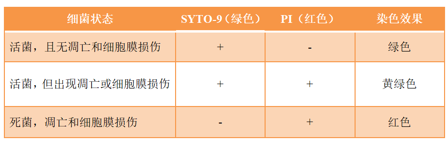 染色原理:SYTO-9是一种能够透过细胞膜的绿色荧光核酸染料,可用于活的和死的真核细胞的RNA和DNA染色,以及革兰氏阳性和革兰氏阴性细菌。PI是一种可对DNA染色的细胞核染色剂,在嵌入双链DNA后释放红色荧光。PI不能穿透完整细胞膜,但对凋亡晚期细胞和死细胞的破损细胞膜能够穿透,并使细胞核红染。