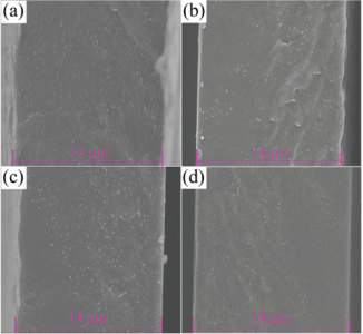 图1. 不同热处理温度下50vol% PMMA/PVDF共混物薄膜的SEM图像:(a)60℃,(b)100℃(c)150℃(d)200℃。