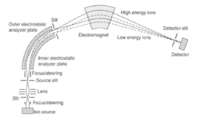 磁质谱(Magnetic sector mass spectrometer)是指根据相同动能的离子在相同磁场中的偏转结果不同将它们区分开的一种技术。磁质谱分为磁偏转单聚焦型和双聚焦型,其中高分辨双聚焦磁质谱是目前应用最为广泛的,它所采用的质量分析器为扇形电磁质量分析器。在1910年左右,Thomson用磁场和电场来分离具有不同质量和能量的离子。高分辨、双聚焦的质量分析器分别由Mattauch和 Herzog在20世纪30年代,Johnson和Nier在20 世纪50年代研制而成。它的基本原理图如图一所示:离子源发出的离子首先经过聚焦进入电场,电场将不同动能的离子加以区分后,离子又进入磁分析器。磁分析器根据离子的m/z值对离子进行区分,同时,也会将具有不同动能的离子聚焦到不同的位置。高分辨双聚焦磁质谱具有很好的重现性、很好的定量分析能力以及很宽的动态分析范围。由于其价格比较昂贵,体积庞大,应用相较其他的高分辨质谱仪器少,但是它在高分辨率定量分析方面的地位是不可动摇的,目前常用于确定同位素比例、分析有毒物质及其类似物(如二恶英)等。