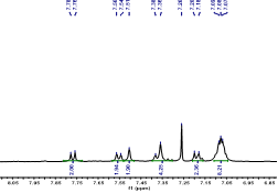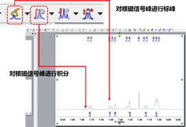 对应地,借助拖动放大功能,将关键核磁峰位置的区域放大,对核磁谱图进行标峰和积分,处理谱图如下所示,可以分析信号峰的偶合裂分和偶合常数。
