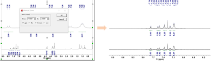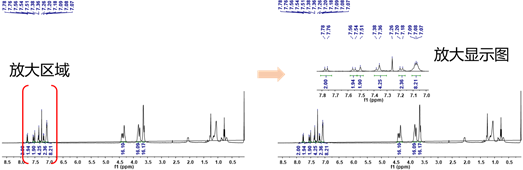 在核磁谱图局部比较密集的情况下,需要对局部核磁进行放大显示标注特征峰,可以点击Expansion按钮,拖选放大区域进行局部放大,如下图所示