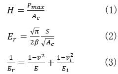 根据这些参量及下列(1)、(2)、(3)三个关系式,可以计算出硬度(H)和弹性模量(E):