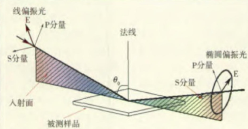 椭偏仪测试样品性能指数时通过样品反射或者透射光线偏振状态的变化来完成的,测量光经过样品表面时偏振态的变化如图1所示,偏振光到达样品表面时发生反射,出射光的偏振态发生变化,通过测量这种变化,可计算出样品的性能参数。