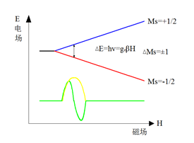 图1电子自旋能级分裂及能级吸收曲线示意图