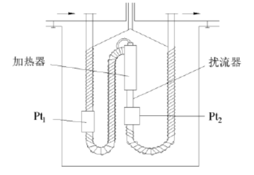 图1为量热器的示意图,通过加热器对设备中运行的被测物质进行加热,扰流器的作用是使在加热器中被加热的流体混合均匀,不出现较大温度梯度。