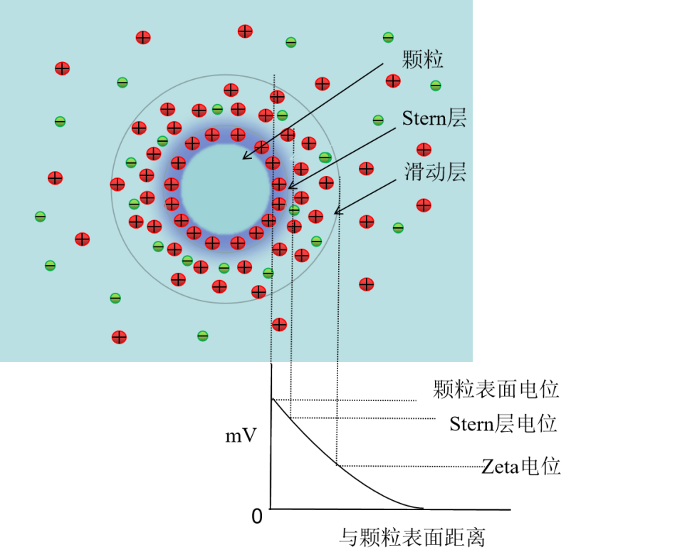 Zeta电位(Zeta Potential,ζ-电位)是指剪切面(Shear Plane)的电位,是表征胶体分散系稳定性的重要指标。大部份分散在溶剂中的颗粒主要都是由表面基团的电离或带电粒子的吸附而获得表面电荷,此电荷在溶剂中会吸引周围的异号电荷,在两相交界处形成双电层即所说的双电层模型-Stern双电层。Stern双电层模型将双电层分为两部分-Stern层和扩散层(图1)。Stern层为吸附在颗粒表面的一层电荷组成的一个紧密层,由颗粒表面到Stern层平面的电位呈现下降的趋势,降到紧密层时的电位称为Stern电位。Stern层外异号离子成扩散状态分布,称为扩散层。当施加外界电场时,颗粒做电泳运动,紧密层(Stern层)结合一定的内部扩散层与分散介质发生相对移动时的界面称为滑动面。颗粒表面电位降到滑动面时的电位称为Zeta电位,即Zeta电位是连续相与附着在分散粒子上的流体稳定层之间的电势差。