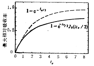 如果I(v0)为最大吸收时的计数,则它与基线的差值最大,此时n(v0)称为最大相对吸收率。由于使用相对吸收率的穆斯堡尔谱,其谱形并不因此而改变。但由于去掉了基线的影响,即非共振吸收的影响,就使得谱线便于比较和分析。最大相对吸收率大,吸收峰高度数值大,同时面积也大,是反映共振效应大小的物理量。最大相对吸收率依赖于吸收体的有效厚度和源的无反冲分数。对于确定的源无反冲分数是确定的常数。图1画出了最大相对吸收率随吸收体有效厚度变化的关系曲线。