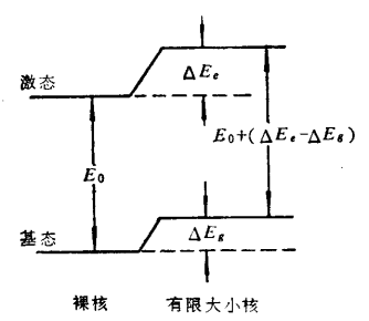 同质异能移有时也称化学能移。它起源于核电荷与核所在处电场的单极相互作用,亦即核电荷与核所在处由其它电荷引起的电场之间的库仑相互作用。假设一个原子核在核外无电子也无配位近邻原子的情况下,其基态与第一激发态能级间能量差为E0;若核外有电子或配位近邻原子时,库伦相互作用将使基态与激发态能级都发生变化。由于原子核有一定形状和大小,而且一般情况下基态与激发态时核所占体积不同,这就造成基态能级的变化量△Eg和激发态能级变化量△Ee。不同,因此基态----激发态能级差不再是E0,而是E0+(△Ee-△Eg),如图1所示