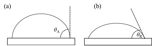 图1 (a)增加液体,接触角前进。每一次运动中止时,液体呈现出前进接触角(θA);(b)移动液体,接触角后退,接触角减小,液滴呈现后退接触角(θR)