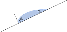 在倾斜面上,可以同时看到液体的前进角和后退角,若没有接触角滞后的话,平板只要稍微倾斜液滴就会滚动。