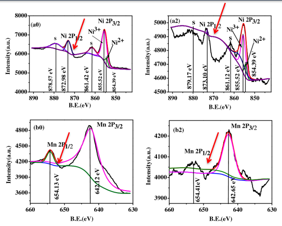 图中数据分析错误的点有:扣背景的基线错误,Ni元素随意标注价态,Mn元素的2p3/2与2p1/2的面积比列不对。