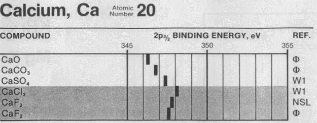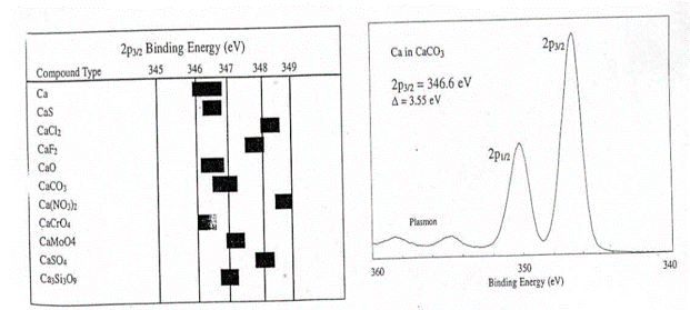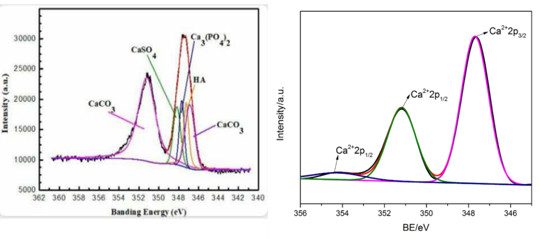 图中未能正确认识轨道自旋分裂峰的概念,下图是Ca元素的数据手册资料,从资料中可以看出Ca的p轨道是轨道自旋谱峰,2p3/2与2p1/2一对是一种化学态,图一2p3/2居然四个并标注了所谓的化学态,2p1/2却只有一种化学态,面积比列2:1就更不用说了。图二是谱峰的认识错误,从资料中可以出是plasmon(损失峰)。