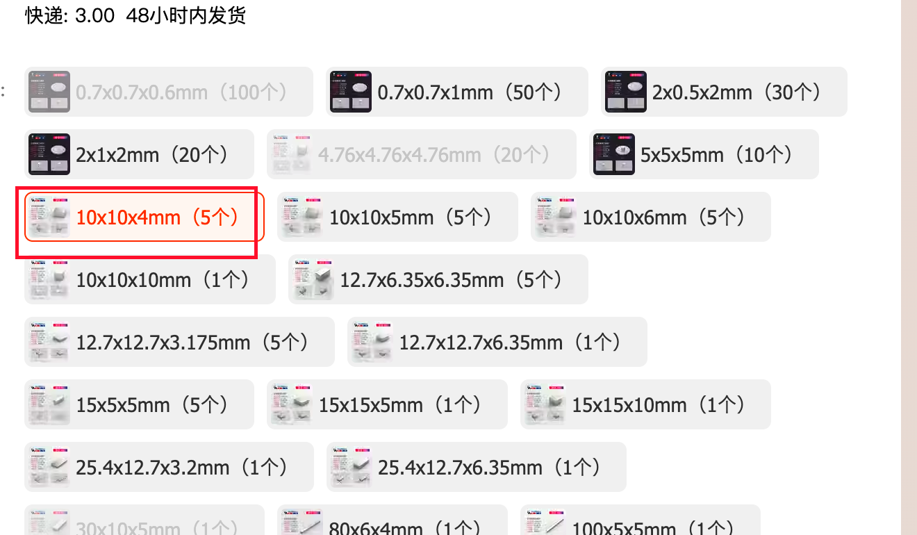 具体型号:10×10×4mm,一组5个,使用时5个竖着列一起