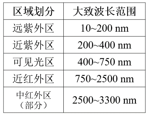 光的本质是一种电磁波,光的波长越短、频率越高,其能量越大。根据光波长的长短,可将光划分为不同区域,如图1。光子是光的能量载体。光谱则是描述某种特定光的波长(单个光子能量)和强度(光子的密度)之间的关系的图谱。