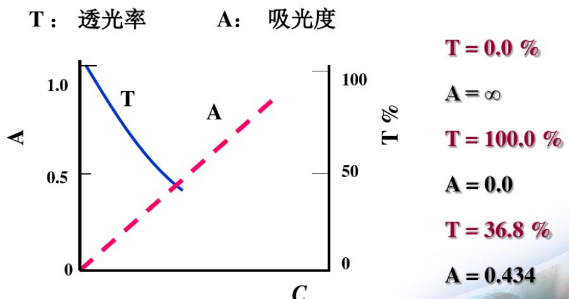 一束单色光通过样品后,入射光光强I0减弱为I,则透光率:T = I/I0,或用百分透光率表示:T% = I/I0 x 100%。