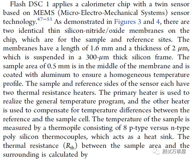 Flash DSC 1采用了基于MEMS (micro - electromechanical Systems)传感器技术的双传感器量热计芯片。芯片上有两层相同的氮化硅/氧化膜,分别用于样品和参考位点。薄膜长度1.6毫米厚度2μm,悬浮在一个300 -μm厚的硅框架上。0.5 mm的样品区位于薄膜中央,并涂有铝以保证均匀的温度分布。传感器的样品和参考侧各有两个热阻加热器。主加热器用于实现通用温度程序,另一个加热器用于补偿参考单元和样品单元之间的温度差。