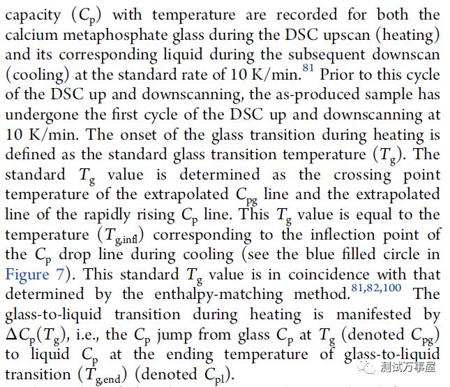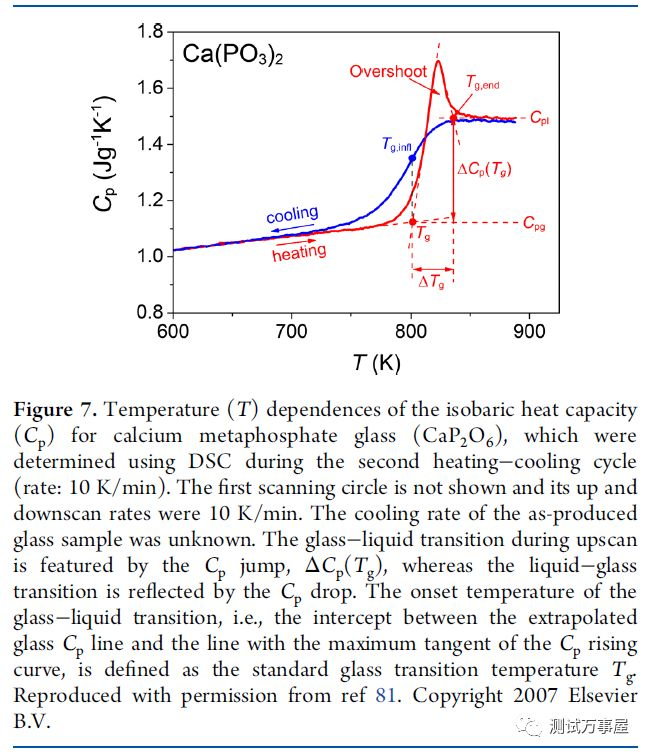 通过DSC检测技术研究了玻璃化转变的过程。玻璃化转变的特性和关键参数如图7所示,为偏磷酸钙玻璃(CaP2O6)的等压热容(Cp)与温度(T)关系的DSC图谱,在第二加热冷却周期(速率:10k /min)使用DSC测定。