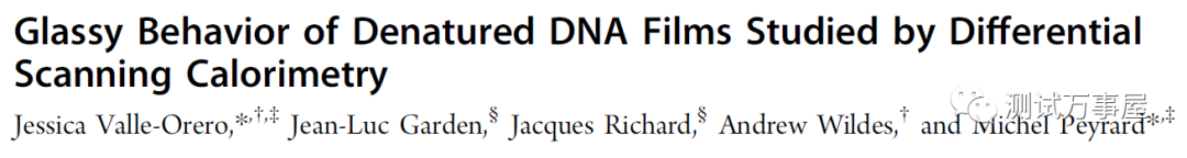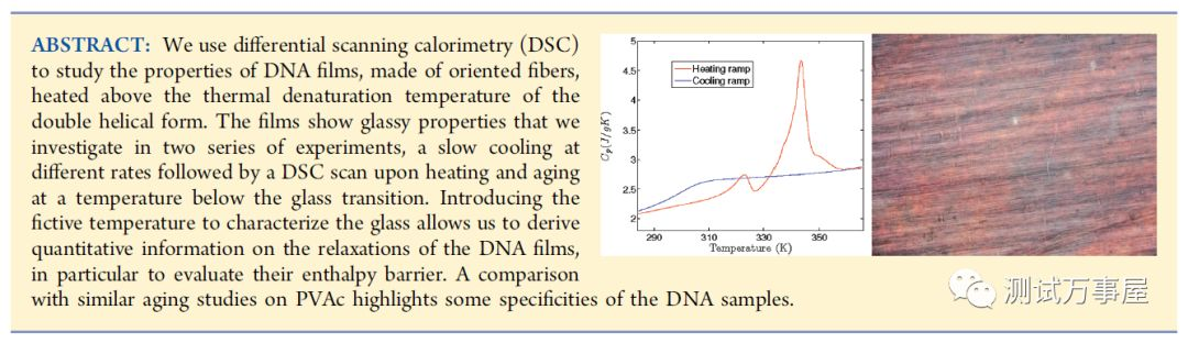 这篇文章利用差示扫描量热法(DSC)研究了DNA薄膜的性质。该研究在两个系列的实验中研究了这些薄膜的玻璃属性,即在不同速率下的缓慢冷却,然后在加热和低于玻璃化温度的老化下进行DSC扫描。引入假设的温度来表征玻璃从而推导和获得DNA薄膜弛豫的定量信息,特别是评估它们的焓势垒。与类似的PVAc的老化研究做对比突出了DNA样本的一些特殊性。