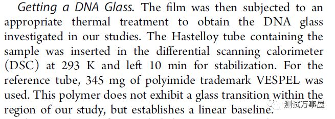 首先对薄膜进行适当的热处理以获得我们研究中所需的玻璃化DNA薄膜。将含有样品的哈氏管插入差示扫描量热计(DSC)中,温度设置为293 K,静置10 min使其稳定。标准管使用的是商标为VESPEL的345 mg聚酰亚胺。这种聚合物在研究区域内不表现出玻璃化转变,而是建立一个线性基线。