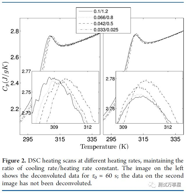 该研究利用差示扫描量热法(DSC)研究了DNA薄膜的相关性质。图2为相同冷却速率与升温速率之比下的升温曲线,并与τ = 60 s时(左图)的卷积及τ = 0 s时(右图)没有卷积的数据进行对比。左边的图像显示了相同的振幅处所有的峰值。这种效果只有在用合适的时间常数对数据进行反卷积时才能实现,而且不会因为样品在坩埚内的热接触不良而出现热滞后。通过对两幅图像的比较,不仅证明了所选择的量热时间常数是可靠的,而且证明了实验是在薄膜和样品(或参考)内的均匀温度下进行的。