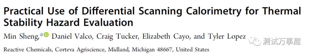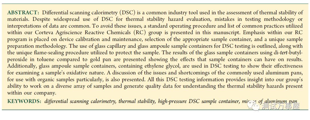 DSC是一种常用的工业工具,用于评估材料的热稳定性。尽管DSC广泛用于热稳定性危害评估,但在测试方法或数据解释方面的错误是常见的。为了避免这些问题,该研究的Corteva Agriscience反应性化学品(RC)组使用的标准操作程序和常见做法清单在本文中进行了介绍。