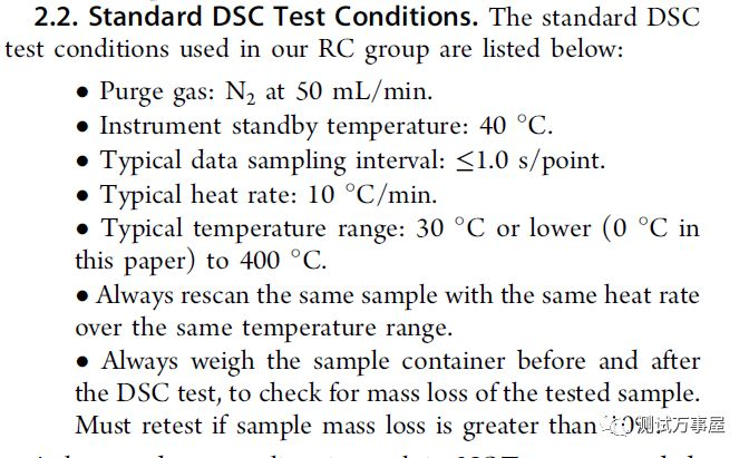 用于RC组标准的DSC测试条件如下:N2为50毫升/分钟。仪器待机温度40 ºC,数据采样间隔为1.0 s /点,加热速率10 ºC /分钟,典温度范围为30 ºC(或更低)到400 ºC。总是在同一温度范围重新扫描具有相同热率的样本。总是权衡前后试样容器DSC测试,检查测试样品的质量损失。如果样品质量损失大于10%,必须重新测试。