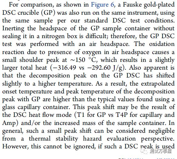 如图6所示,我们还在相同的仪器上运行了一个福克斯的镀金DSC坩埚(GP),使用的是我们标准DSC测试条件下的相同样品。如果不将GP样品容器密封在氮气箱内,使其顶部空间惰化是困难的;因此,GP DSC测试是在真空条件进行的。空气顶空中氧的存在引起的氧化反应在150℃时产生一个小的峰,这会导致一个较大的总热量(316.49 vs 292.60 J/g)。同样明显的是,GP DSC上的分解峰已经轻微地向更高的温度移动。因此,用GP外推分解峰的起始温度和峰值温度比用玻璃毛细管容器发现的典型值要高。这种峰的位移可能是由于DSC热流模式(GP为T1,而毛细管和放大器为T4P)和/或样品容器质量增加的结果。一般来说,从热稳定性危险评估的角度来看,这样一个小的峰的位移可以被认为是微不足道的。