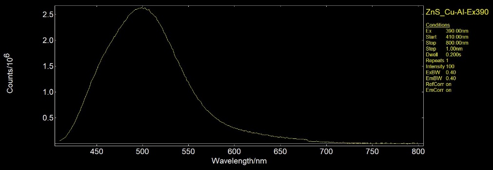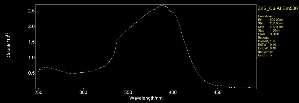 图4是爱丁堡软件界面呈现的激发发射谱测试结果。左边是激发谱,监测波长是500 nm,右边是发射谱,激发波长390 nm.主要的参数信息为 Step(步幅):1 nm;Dwell Time(每步幅积分时间):0.2 s;Repeats(重复次数):1,激发发射狭缝均为0.4,勾选了激发发射校正。
