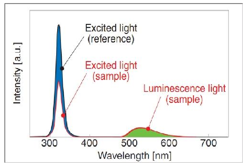 测量子产率时,需要用到积分球将所有散射光、发射光收集,先后测试样品和参比样两条曲线。测固体样通常选择BaSO4标样或者空的石英皿作参比;测液体样通常选择对应的溶剂作参比。如图5,测试参比样的曲线中,激发光照射到参比样,获得激发光谱,即总光子数。然后在样品容器中放入样品,同样条件下,激发光照射获得未吸收光子数和发射光子数。通过发射光子(绿色区域)和吸收光子数(蓝色区域)的比值,计算出内量子产率。